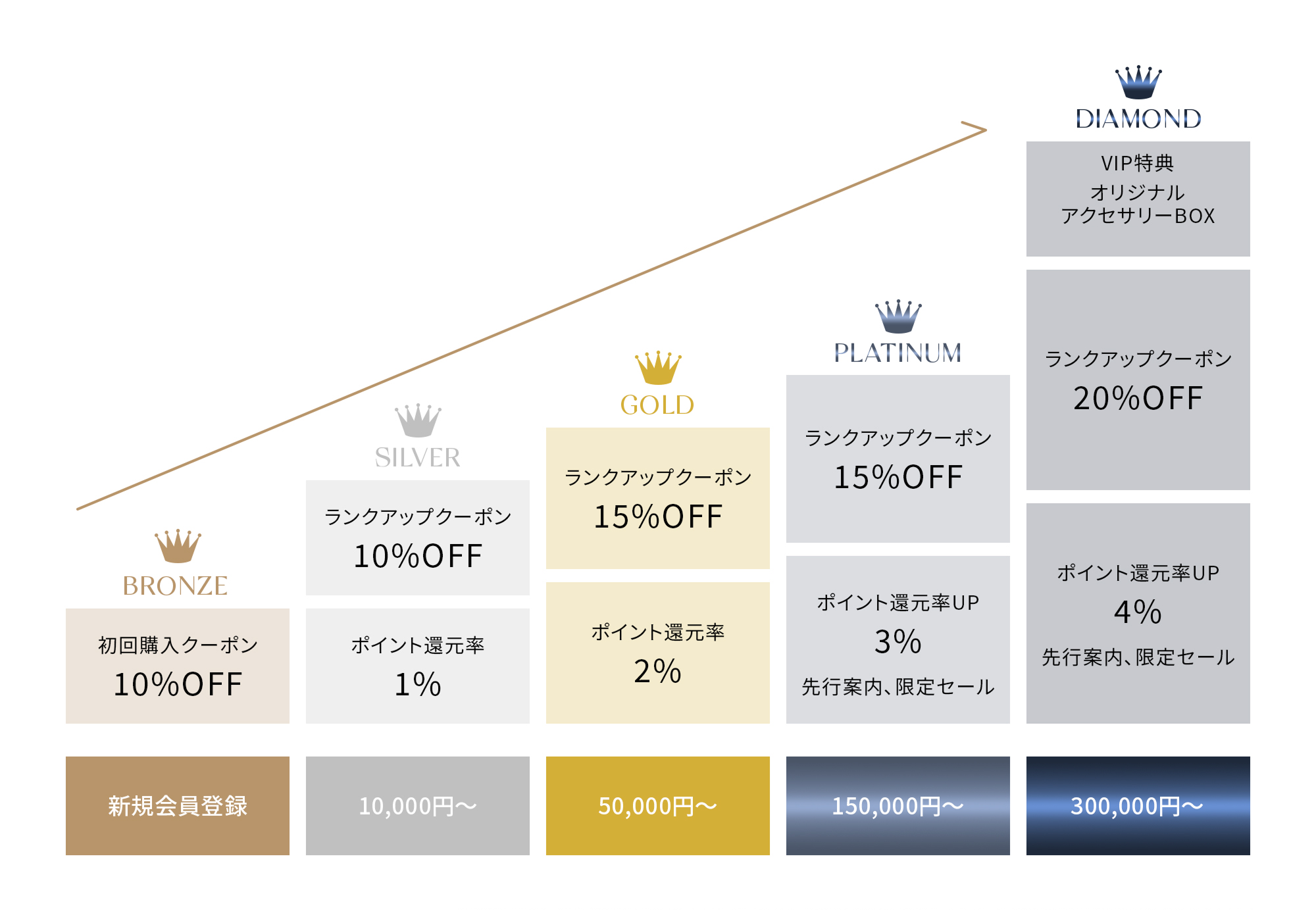 1年間の累計購入金額に応じた5つのステージごとに特典やサービスをご提供いたします。