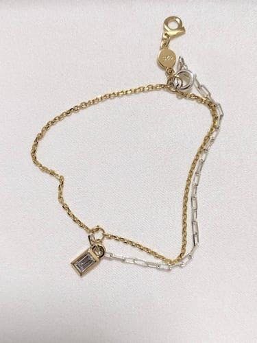 バゲットストーンとコンビカラーのチェーンが調和してモダンな感じのブレスレットです。