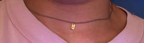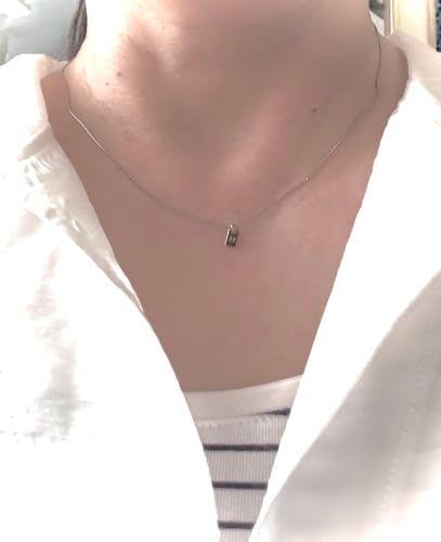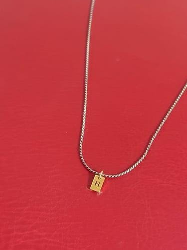 ゴールドカラーを加えたフラットなタグペンダントに、イニシャル刻印でさりげないポイントを添えたコンビカラーネックレスです。